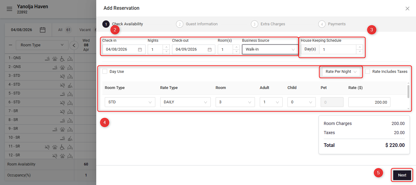 Reservation Details: On the first page titled Check Availability, fill in the Check-In, Check-out, Number of nights, Room number and Business source details.