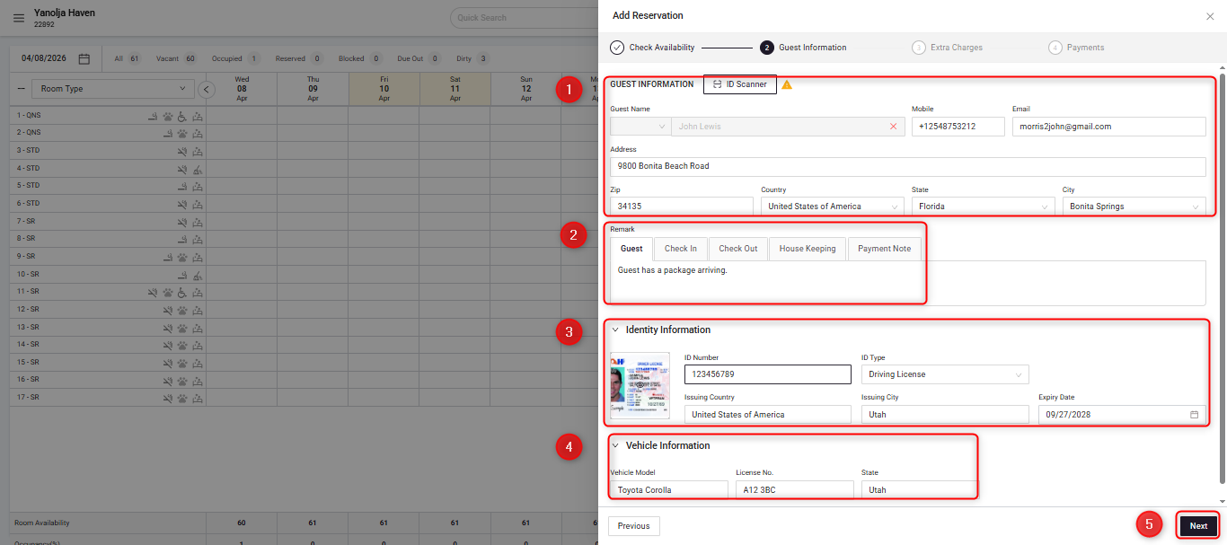 Guest Information: If an ID Scanner is integrated, click ID Scanner and scan the guest’s driver’s license or ID. The system will automatically populate the guest details. Alternatively, you can manually enter the guest information.