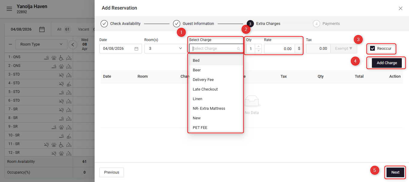 Click Add Charge to include the charge in the reservation.