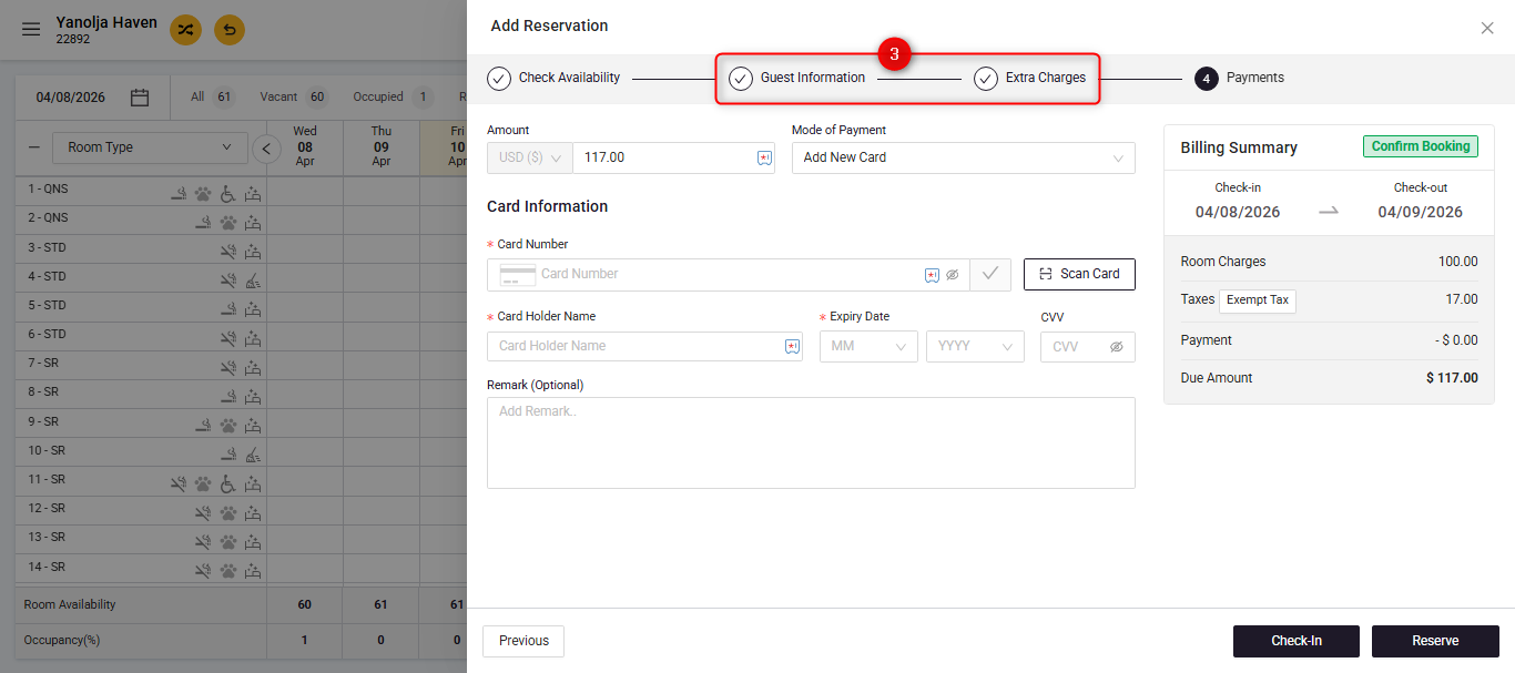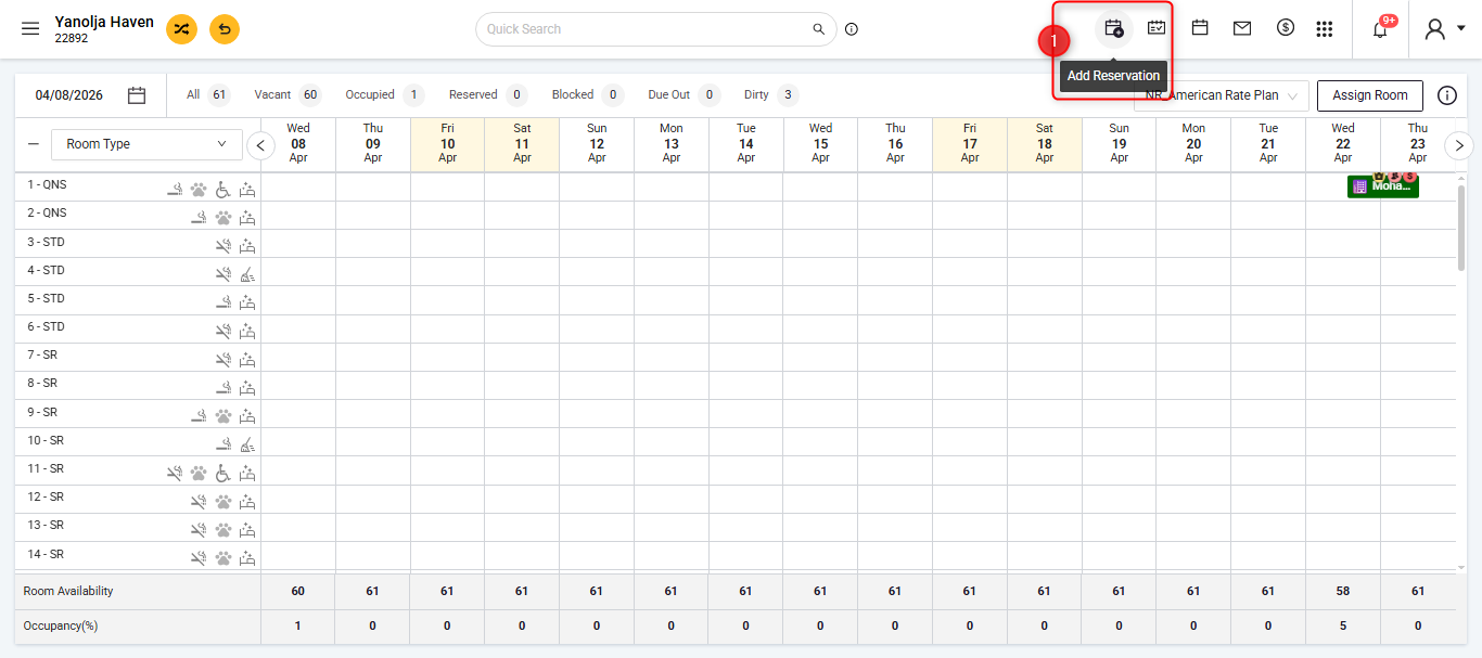 - Click on “Add Reservation” to begin creating a new booking.