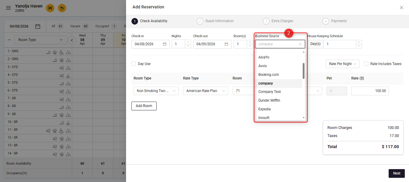 - In Stage 1: Check Availability, click on “Business Source” and select the company you want to associate with the reservation.