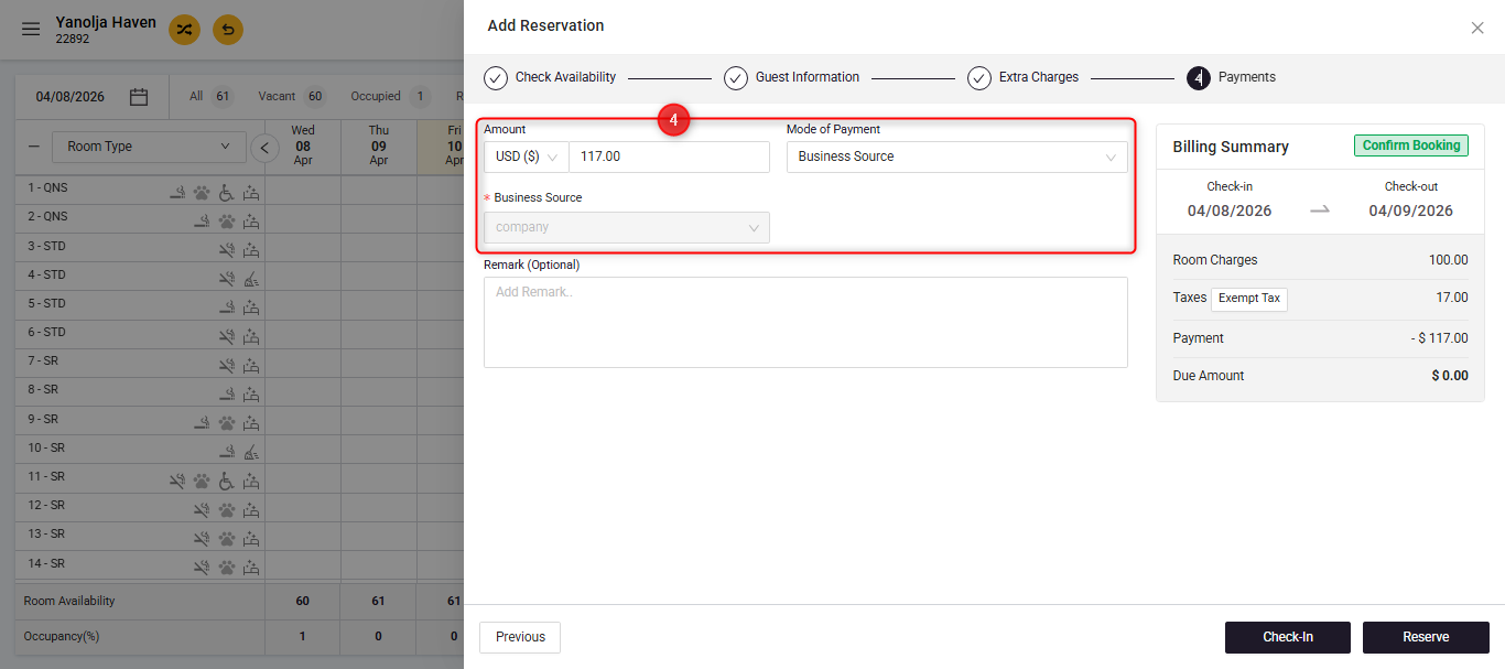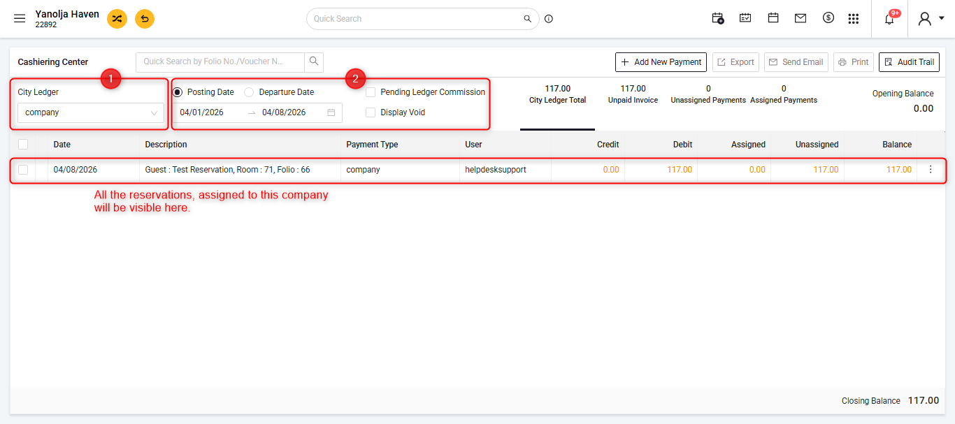 Once the reservation is finalized, the payment will be automatically assigned to the selected company. You can also view this transaction in the Cashiering Center.