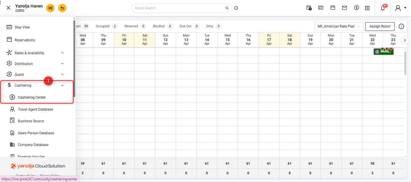 - Click on the Hamburger Menu (☰) in the top-left corner of the screen. Select “Cashiering” from the menu options. Click on “Cashiering Center”.